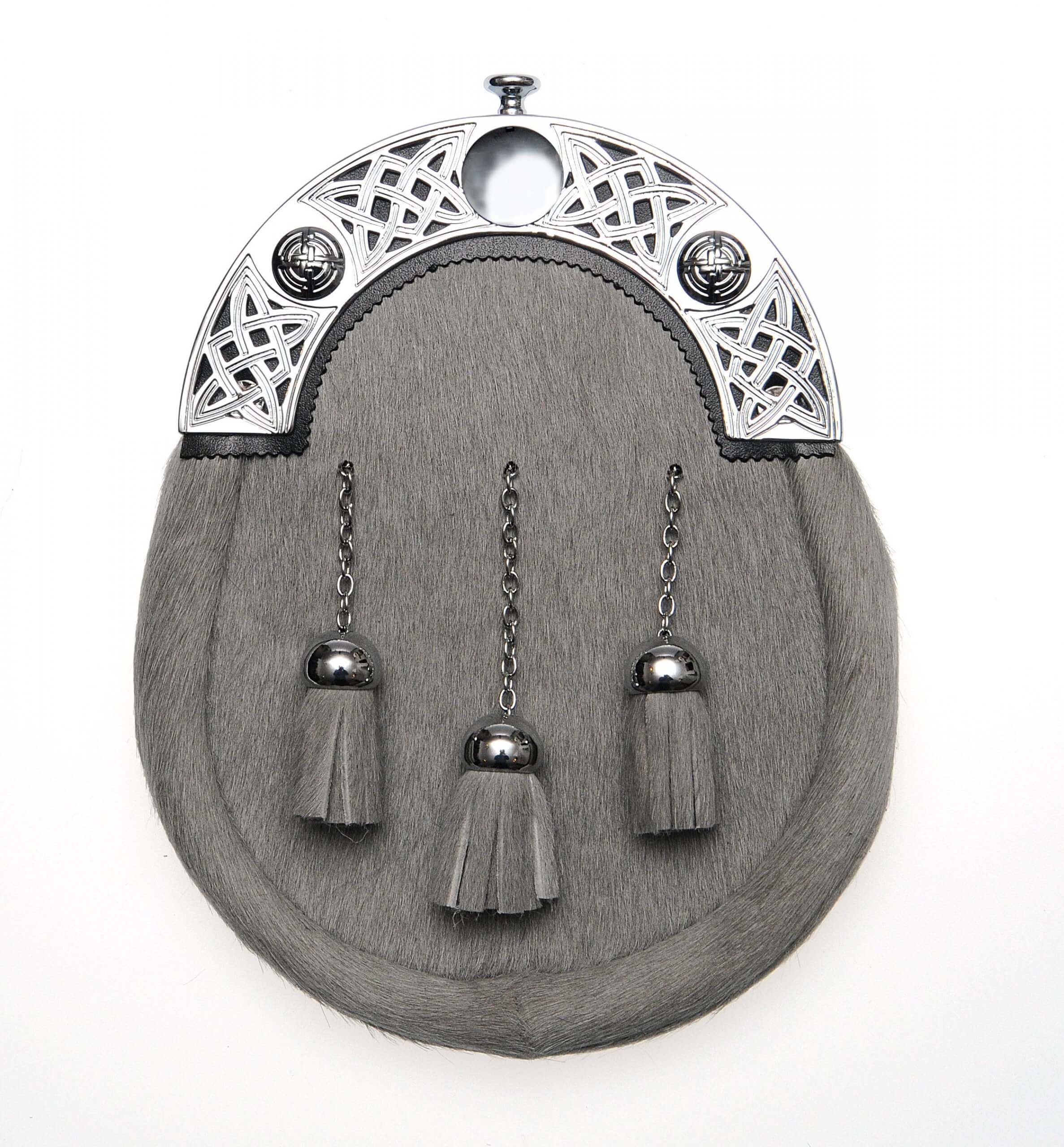 A grey Celtic-inspired sporran designed for dress occasions, featuring durable bovine leather, featuring a polished chrome cantle and enhanced with refined embellishments. This piece is perfect for those who appreciate the rich symbolism of Scottish nature, adding authenticity to your Highland attire. Pair it with a kilt, waistcoat, and sgian dubh for a complete look steeped in tradition.