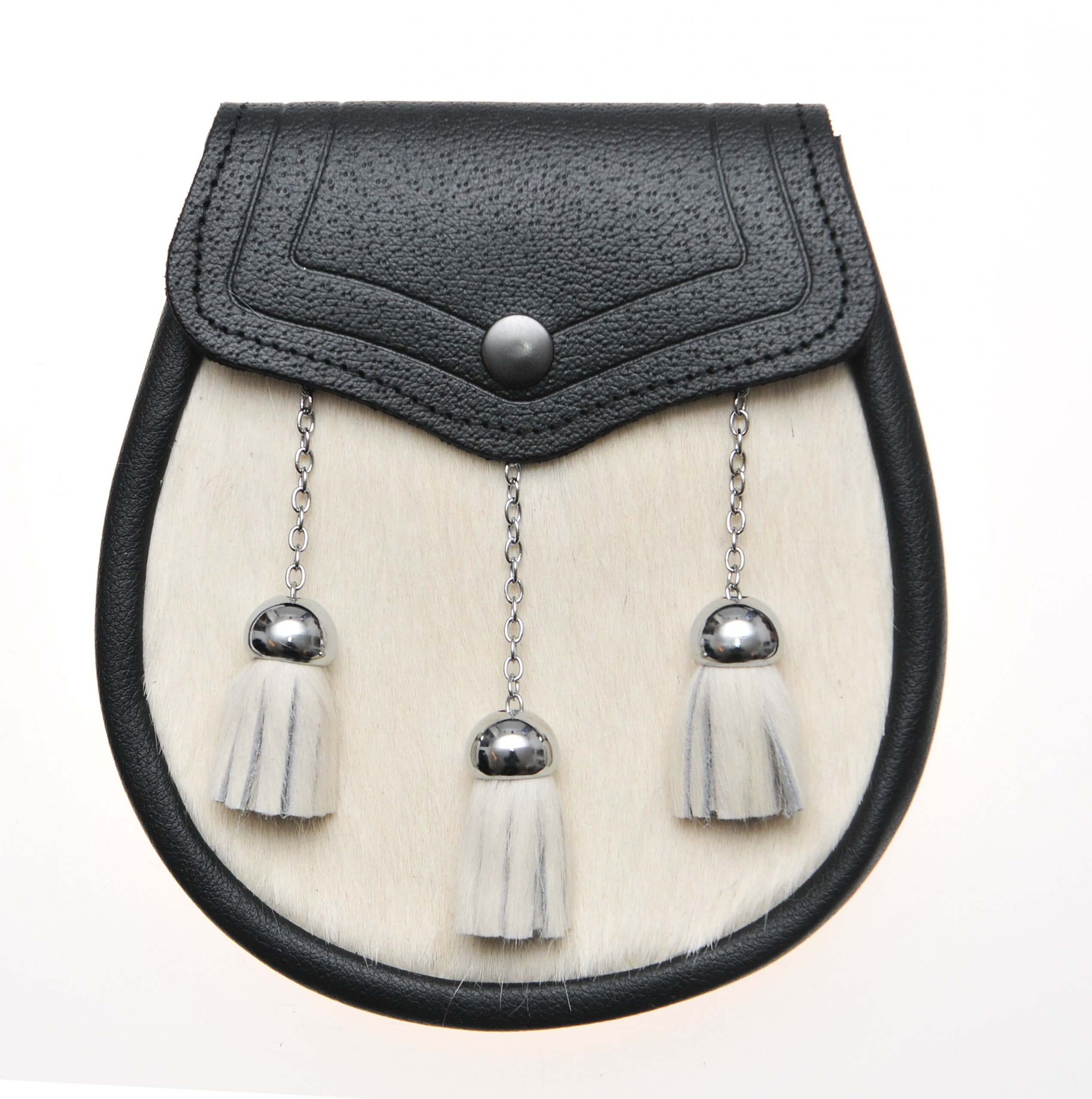 Hand crafted in Scotland, this celtic design semi dress sporran is finished in cream bovine with a genuine leather top, the perfect accompaniment to your highlandwear for all occassions.
