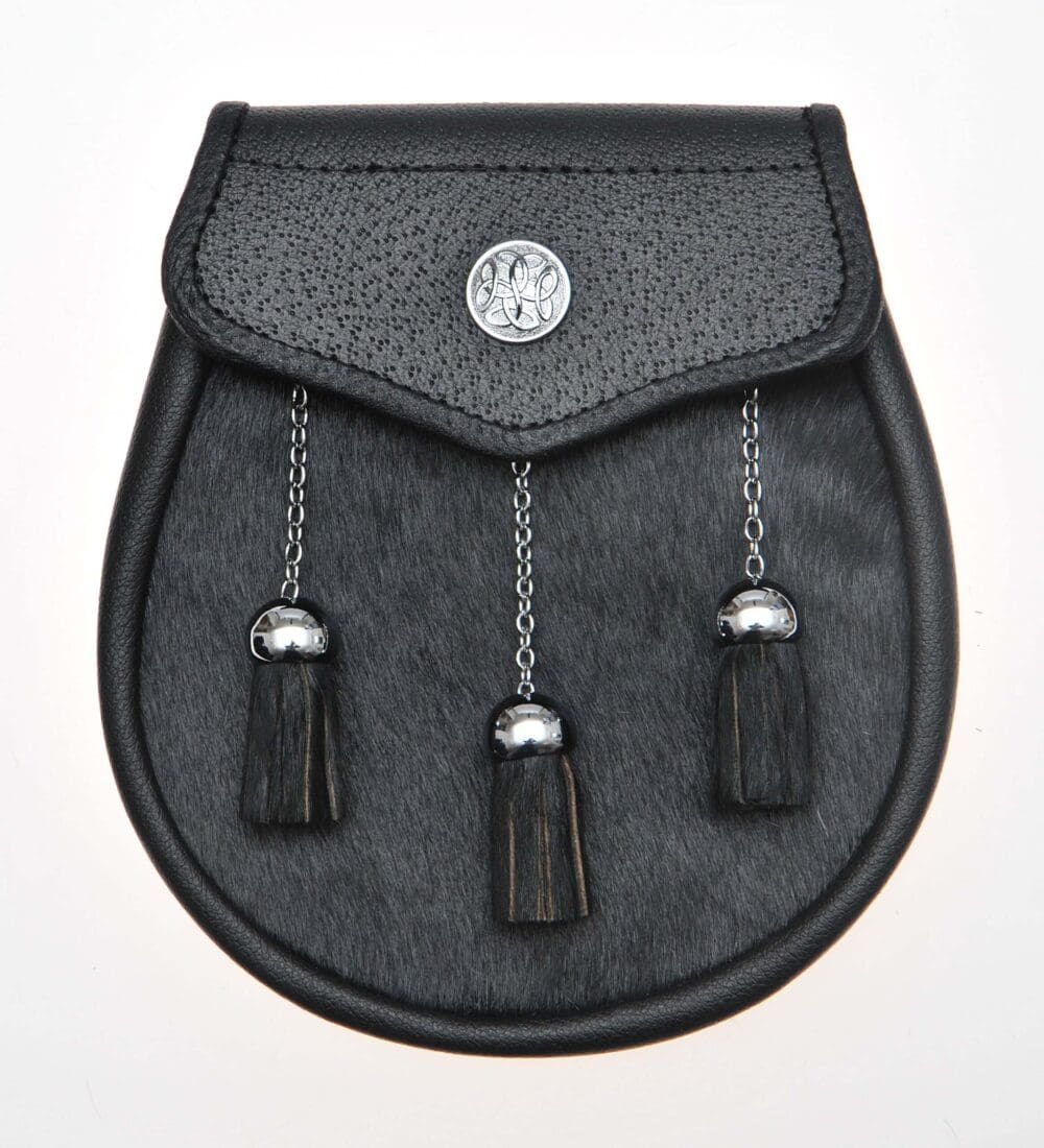 Hand crafted in Scotland, this celtic design semi dress sporran is finished in black bovine with a genuine leather top, the perfect accompaniment to your highlandwear for all occassions.